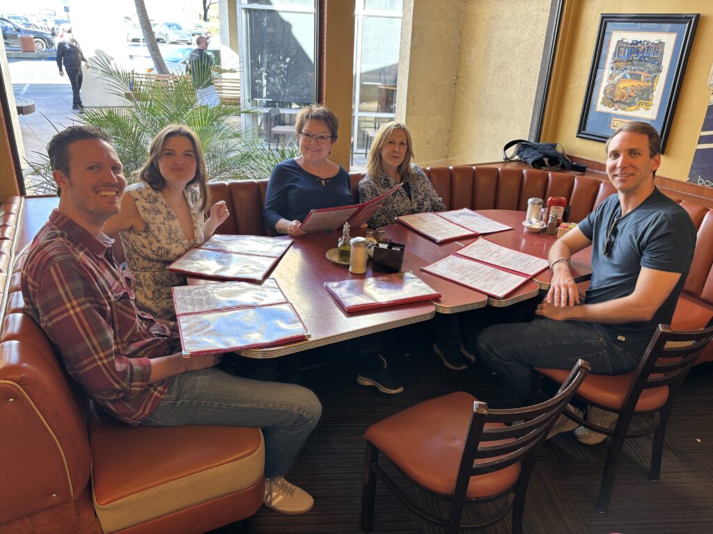 I met Owen in December, 2024, in Los Angeles at a Transcendental Meditation (TM) group meditation. Because of teacher Denny Goodman, the West L.A. TM centre may be one of the few worldwide which holds daily group meditations, and when we were spending our winters in California Barb and I seldom missed attending. But it was in January that I really started to get to know Owen. During the massive fires, Barb and I, along with a few other friends, volunteered at the Pasadena Community Job Centre which had been turned into a donation and distribution centre for water, food and clothing. Owen and his girlfriend Alexis were to join us on Martin Luther King Day but, given the holiday, we found that there were far more volunteers than jobs. Since we were already in the Valley, Owen came up with the terrific idea of attending an impromptu memorial for the recently deceased David Lynch which had emerged in Burbank at the Bob’s Big Boy. If you don’t understand why that location click here. We enjoyed the outdoor memorial, chatting up dozens of Lynch fans, before finally being seated inside to savour our own chocolate milkshakes. Owen explained to me his love of Lynch and how it was through the filmmaker that he made his way to TM. He and I have been good friends ever since.